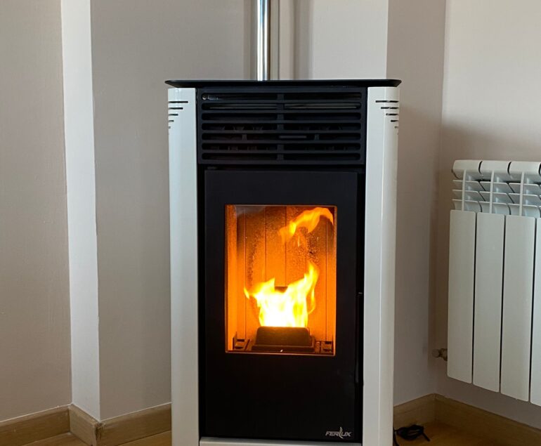 Instalación de estufa de pellet Ferlux Ares de 10 kw en color Marrón Vintage. En este caso, nuestros clientes disponían de calefacción por acumuladores, y no les generaba suficiente calor en la vivienda. Decidieron instalar una estufad de pellet en la planta inferior, modelo Ares 10 kw, aprovechando la chimenea de obra del tejado, que nunca habían utilizado. Para esta instalación se utilizó una salida de humos vertical, para poder arrimar la estufa a la pared, se abrió el forjado, donde está localizada la chimenea de obra en el tejado, y se entubó hasta arriba. Queda muy bonita. Los clientes están encantados con esta estufa y con la instalación.Detalles imagen