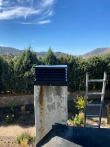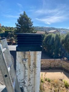 Instalación de Caperuza fabricada a medida para la chimenea. Un cliente nos solicitó deshollinar y cambiar la caperuza de su chimenea, que estaba destrozada y oxidada por el paso del tiempo y por no ser del material adecuado. Medimos el exterior de la chimenea para realizar una caperuza a medida y le pusimos, por dentro, una malla para evitar que entren pájaros en la chimenea. El cliente está encantado con el resultado.