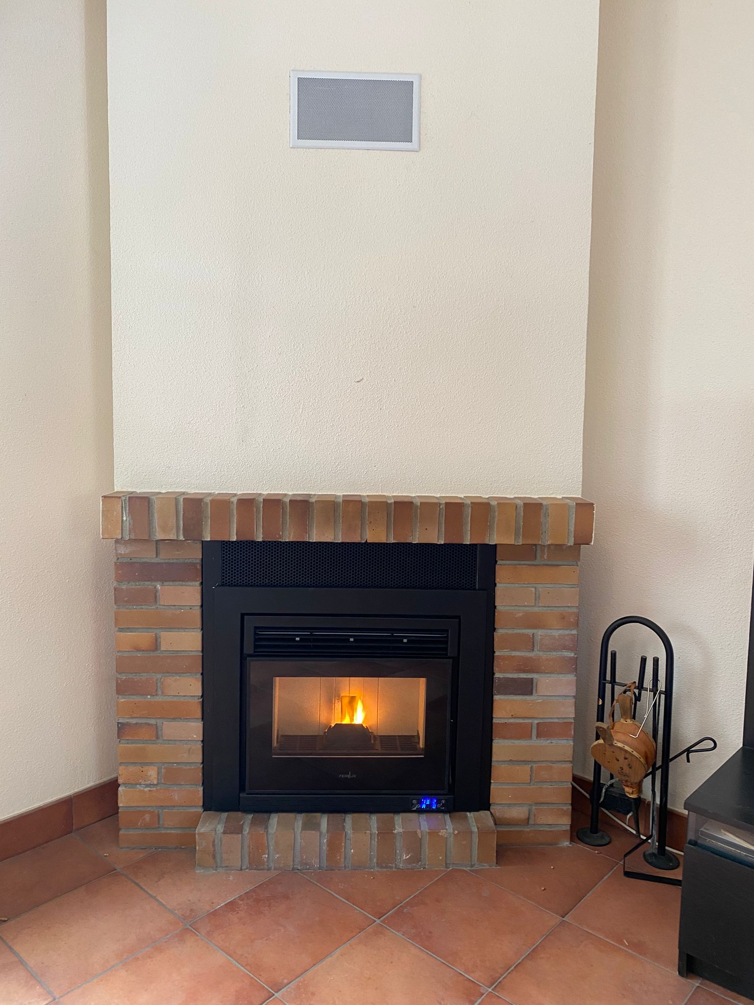 Instalación de estufa de pellet Ferlux Ares de 10 kw en color Marrón Vintage. En este caso, nuestros clientes disponían de calefacción por acumuladores, y no les generaba suficiente calor en la vivienda. Decidieron instalar una estufad de pellet en la planta inferior, modelo Ares 10 kw, aprovechando la chimenea de obra del tejado, que nunca habían utilizado. Para esta instalación se utilizó una salida de humos vertical, para poder arrimar la estufa a la pared, se abrió el forjado, donde está localizada la chimenea de obra en el tejado, y se entubó hasta arriba. Queda muy bonita. Los clientes están encantados con esta estufa y con la instalación.Detalles imagen