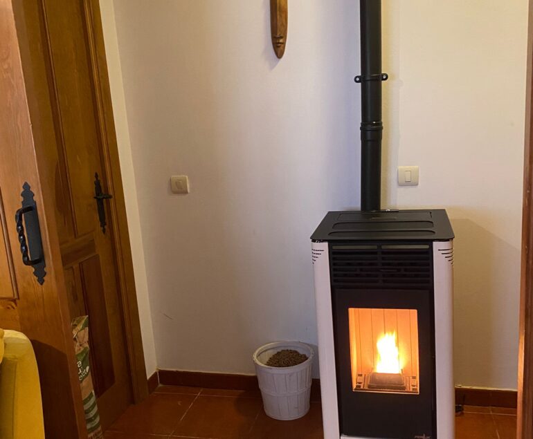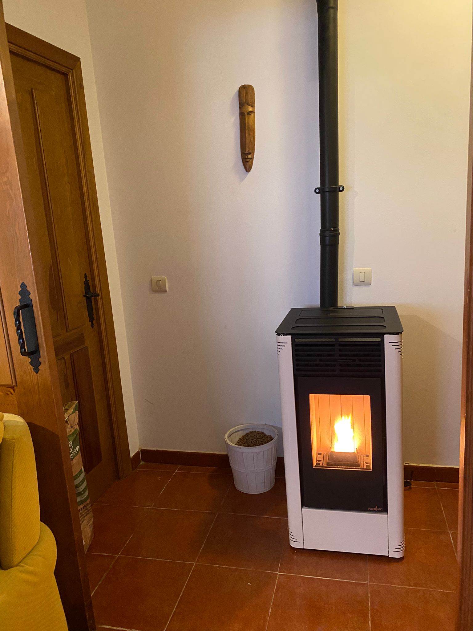 Instalación de estufa de pellet Ferlux Nerea de 10 kw en color Marrón Vintage. Una estufa esta ubicada en la cocina de la vivienda, y caldea una buena parte de la casa; estos clientes no tienen otro tipo de calefacción en la vivienda, en un futuro pondrán otra en el lado opuesto de la vivienda, para llegar a calentar toda la casa. Los clientes está encantada con esta magnifica estufa.